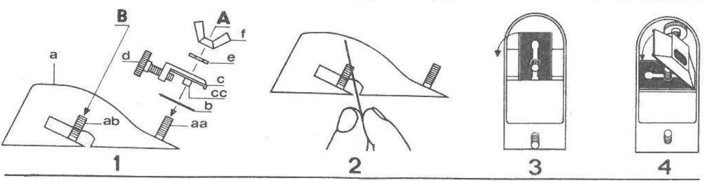 ● 將依照圖 No 4 以螺絲 d 調成傾斜的背鐵 c 裝到螺絲 ab 上;使背鐵的凸點 cc 對準並插入刀片 b 的孔內,同時也對準本體 a 內的凹槽。
